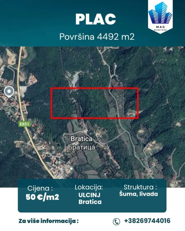 Površina placa 4492 m2 U blizini placa se nalazi put i struja. Pivrsina je pod šumom i dijelom livada.