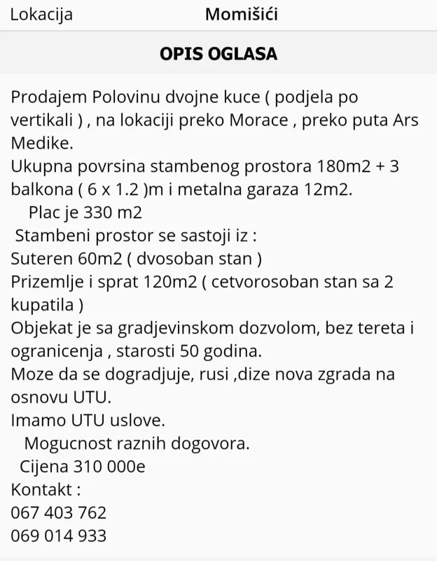 Prodajem Kucu preko Morace preko puta Ars Medika